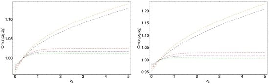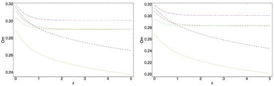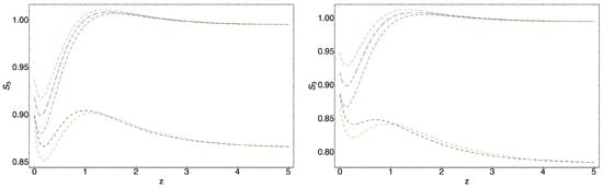 where is given by Equation (54), and interaction parameter b has been changed to . The study of Reference [] shows also that parameter from the statefinder hierarchy is a good indicator to distinguish the models, therefore attention can be concentrated on it only. Moreover, the study of Reference [] shows that is a good analysis for considered models. However, analysis is better for low redshif analysis.