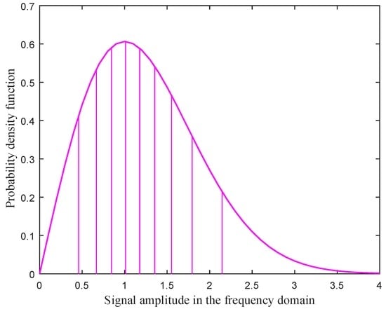 For instance, when the value of L is 10, subsections of Rayleigh distribution, as shown in Figure 1, can be acquired through the process of non-uniform quantization. The x-axis shows the amplitude of the signal in the frequency domain, while the y-axis represents the probability density function of Rayleigh distribution. The probability of received data falling into certain intervals is the area of that interval. It can be qualitatively seen that sequence x falls into ten subsections (1–10) with equal probability.
