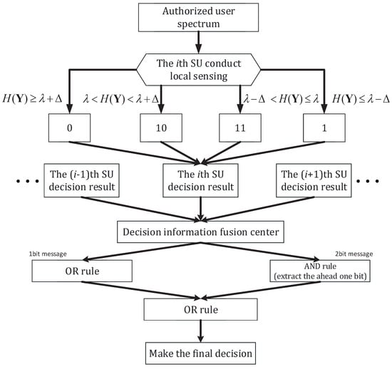 - SUs make decisions based on the decision rules as shown in Figure 4. When exponential entropy is in the reliable information area, SUs use one bit to code decision information; otherwise, when entropy is in the under-reliable information area, they adopt two bits to code decisions. Two kinds of decision information obtained by cognitive users are shown below.One-bit information:Two-bit information: