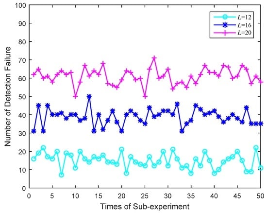 The verification test of detection failure for Shannon entropy is presented in Figure 5. The experiments are divided into three groups, and each group conducts 50 sub-experiments with detection for 100 times. The received signal is AWGN with length and the bin number L in each experiment is , respectively. The abscissa is set as the experiment times and the ordinate is the times of failure detection. It can be seen that there exist different levels of detection failure phenomenon. The proportion of failure obviously rises with L increasing, which can be ascribed to fact that the width of the interval decreases when L increases; therefore, the probability of detection statistics falling into the th interval becomes higher. When , the average rate of failure detection reaches above 50%. To a large extent, high ratio of detection failure causes low detection efficiency and waste of system resources.