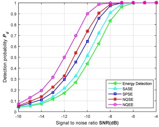 In Figure 6, we compare the detection probability of proposed non-uniform quantized exponential entropy-based detection with entropy-based scheme based on power spectral, Shannon entropy-based detection and energy detection. False alarm probability is 0.1, the variation range of SNR is with step length . Simulation experiments are under the conditions of the additive white Gaussian noise (AWGN) channel. Overall, the detection performance of the proposed scheme is better than several other solutions. Among which, the NQEE detection conducts non-uniform quantization for probability space according to the characteristics of the spectrum obeying Rayleigh distribution, which ensures that the entropy estimation achieves the maximum, thus its performance is superior to other detection schemes. In addition, the NQEE spectrum detection scheme overcomes the detection failure problem of Shannon entropy on the basis of NQSE, and its detection performance is apparently superior to the NQSE algorithm. In particular, when detection probability is equal to 0.9, the SNR of the NQEE is about , realizing a performance improvement effect of about when compared with SASE of .