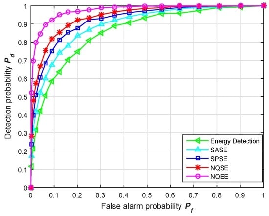 When SNR is equal to , the simulation about the relationship between detection probability and false alarm probability is carried out and the receiver operating characteristics (ROC) curves are shown in Figure 7. Obviously, the NQEE scheme has the best detection performance. Considering , detection probability of NQEE and SASE are 0.9357 and 0.6960, respectively; thus, the performance promotion of NQEE is roughly 0.24. When is greater than 0.3, the detection probability of four kinds of entropy-based schemes are all greater than 0.9, but, in general, we do not care much about the detection performance under high false alarm probability. Due to the standard of the IEEE 802.22 working group, a false-alarm probability less than or equal to 0.1 is the most conducive for full use of valuable spectrum resources. Hence, the detection performance under low false alarm probability should mainly be considered.