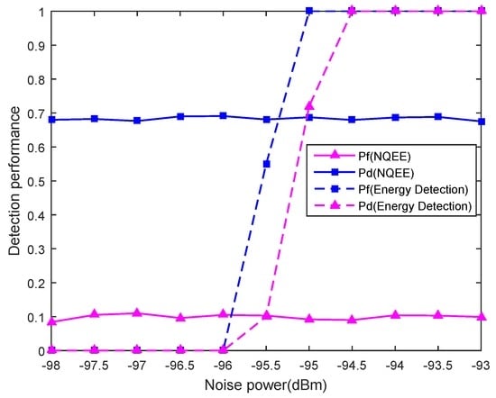 In Figure 8, and of the exponential entropy-based detection remain unchanged with the noise power varying, respectively remaining at 0.6825 and 0.1, which indicates that noise uncertainty cannot affect the performance of the novel entropy-based scheme, and the noise power is when of the energy detection and the NQEE detection are both equal to 0.1. The energy detector is extremely sensitive to the noise power uncertainty, and and become unsatisfactory with the noise uncertainty larger than only . Thus, the energy detection with a fixed threshold is hardly applicable to actual networks due to the background noise fluctuating in almost all of the practical communication systems.