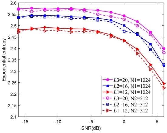 Under the condition that primary signals exist in the authorized spectrum, the simulation about the relationship between exponential entropy and SNR is shown in Figure 9. Sampling numbers are N1 = 512, N2 = 1024, interval numbers are L1 = 12, L2 = 16, and L3 = 20, and the changing range of SNR is . It can be seen that the exponential entropy estimation gets smaller with the increase of SNR. After confirming the decision threshold, detection probability has obvious improvement as SNR increases. On the other hand, it can be derived through the comparisons of three curves that exponential entropy estimation reduces with the reduction of L, thus reducing section numbers is also considered as feasible way to improve detection probability under low SNR. In addition, the sampling number also influences the change of entropy estimation. In this experiment, the entropy estimate index decreases with the increase of sampling points, and detection probability increases with the increase of sampling points. In the case of high SNR, the effect that sampling points exert on exponential entropy estimation weakens.