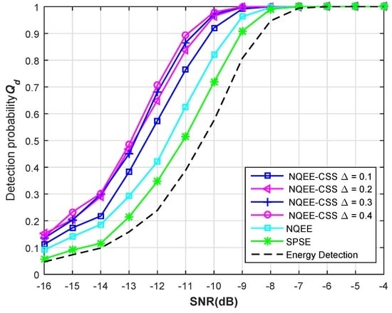 Δ is a significant parameter in an exponential entropy-based CSS scheme, and the setting of its value should be carefully considered. As shown in Figure 10, we study the relationship between SNR and detection probability : false alarm probability and SNR changes from to . Parameter Δ is, respectively, set as . Sample number is 1024, and the number of SUs involved in the CSS M is equal to five. The simulation of exponential entropy-based detection, power spectral entropy-based detection, and energy detection are also shown as contrast curves in the picture. For the fixed SNR, when Δ increases, the detection probability also increases. The reason for this phenomenon is that the probability of exponential entropy estimation information falling into gets larger with the increase of Δ; therefore, the performance of the NQEE-CSS scheme presents an obvious increase. When , the growth rate of detection performance is very small, almost remaining the same. In addition, as mentioned earlier, the detection performance of exponential entropy-based detection method is superior to the power spectrum entropy detection and the energy detection algorithm.