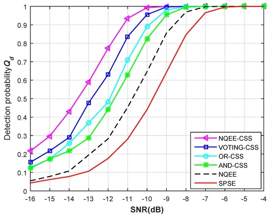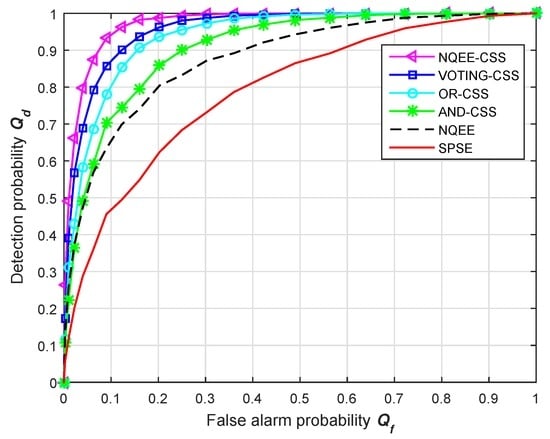 We demonstrate the detection performance of proposed exponential entropy CSS algorithm in Figure 11 and Figure 12. In Figure 11, the SNR range is set as , is 0.1, , parameter Δ is 0.2, and simulation is under the channel of AWGN. The performance of exponential entropy-based detection and power spectral entropy detection with a single secondary user is also analyzed. From the simulation results in Figure 11, we can see that the performance of the NQEE-CSS method is much better than the other three traditional cooperative entropy-based detection schemes (AND, OR, and VOTING rules). Especially when SNR is equal to , the proposed algorithm possesses the 0.162, 0.278 and 0.394 promotion of detection probability, compared with three kinds of traditional collaborative detection methods (based on the exponential entropy), which proves that the proposed CSS algorithm has the superior detection performance with low SNR and is suitable for the actual wireless environment.