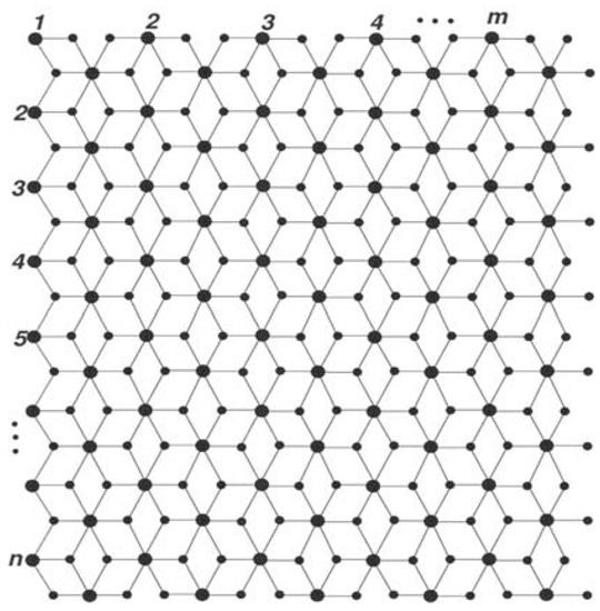 The is the two-parametric chemical graph of three-layered titania nanotubes, where m and n represent the number of titanium atoms in each row and column, respectively (Figure 1). Big dots correspond to titanium atoms, whereas small dots correspond to oxygen atoms, and edges represent bonds.