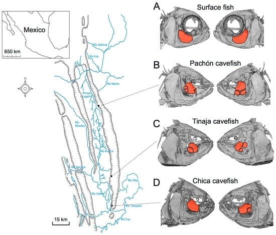 - Gross, J.B.; Powers, A.J. The Evolution of the Cavefish Craniofacial Complex. In Biology and Evolution of the Mexican Cavefish; Keene, A.C., Yoshizawa, M., McGaugh, S.E., Eds.; Academic Press: Cambridge, MA, USA, 2015; p. 193. [Google Scholar]