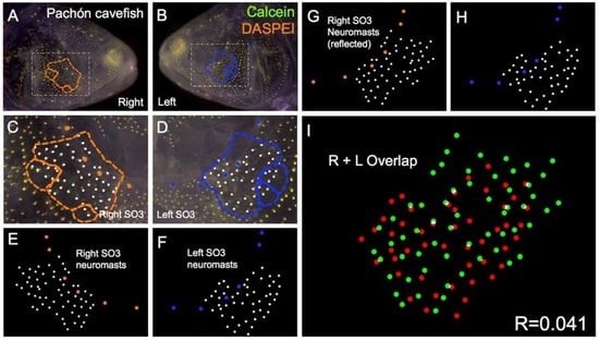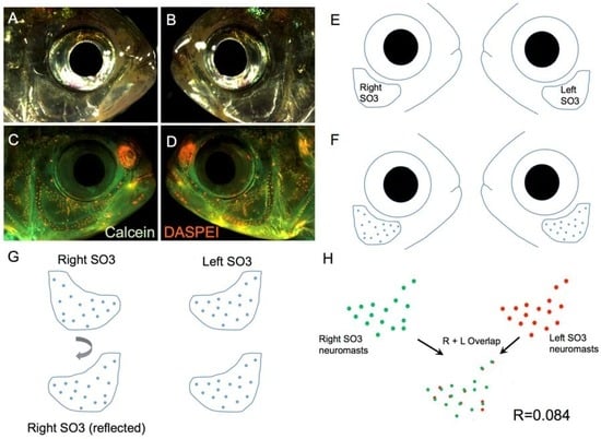 Pachón cave-dwelling Astyanax fish demonstrate asymmetric patterns of neuromast distributions. Several Pachón cave morphs of Astyanax mexicanus were evaluated (n = 30) using live bone stain (green, A–D); and live neuromast stain (orange, A–D); The number of superficial neuromasts distributed across the SO3 bone were noted (white dots, C–H) relative to the positions of the right- (orange dots; C,E,G); and left-sided (blue dots; D,F,H) canal neuromasts; The right-sided SO3 neuromasts were reflected, allowing the right- and left-sided neuromast distributions to be compared quantitatively (I). The correlative value for this Pachón cavefish individual is R = 0.041.