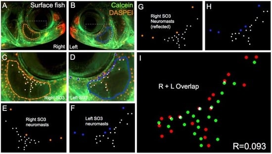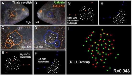 Tinaja cave-dwelling Astyanax fish demonstrate asymmetric patterns of neuromast distributions. Tinaja Astyanax cavefish were evaluated (n = 30) using live bone stain (green, A–D); and live neuromast stain (orange, A–D); The number of superficial neuromasts distributed across the SO3 bone were noted (white dots, C–H) relative to the positions of the right- (orange dots; C,E,G) and left-sided (blue dots; D,F,H) canal neuromasts; The right-sided SO3 neuromasts were reflected, allowing the right- and left-sided neuromast distributions to be compared quantitatively (I). The correlative value for this Tinaja cavefish individual is R = 0.048.