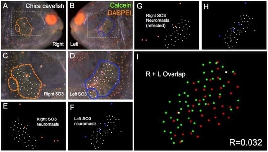 Chica Astyanax cavefish demonstrate asymmetric patterns of neuromast distributions. Several Chica cavefish of Astyanax mexicanus were evaluated (n = 30) using live bone stain (green, A–D); and live neuromast stain (orange, A–D); The number of surface neuromasts distributed across the SO3 bone were noted (white dots, C–H) relative to the positions of the right- (orange dots; C,E,G); and left-sided (blue dots; D,F,H) canal neuromasts; The right-sided SO3 neuromasts were reflected, allowing the right- and left-sided neuromast distributions to be compared quantitatively (I). The correlative value for this Chica cavefish individual is R = 0.032.