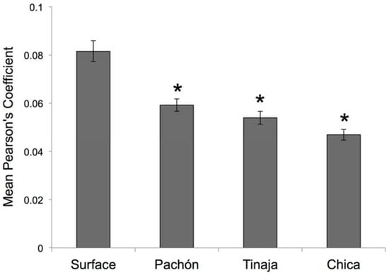 Post hoc statistical analyses reveal significant differences in quantitative symmetry between Astyanax fish. We evaluated if cave-dwelling forms demonstrate the same degree of asymmetry in neuromast patterning as surface-dwelling fish. Based on the results of a highly significant one-way Analysis of Variance (ANOVA; p << 0.001; see Section 2), we performed post hoc independent Student’s t-tests and found that each of three cavefish populations harbored significantly lower values of mean neuromast positional symmetry compared to surface-dwelling fish. * p < 0.05; n = 30 individuals per group.