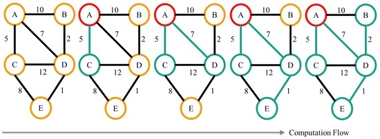 - Prim, R.C. Shortest connection networks and some generalizations. Bell Syst. Tech. J. 1957, 36, 1389–1401. [Google Scholar] [CrossRef]