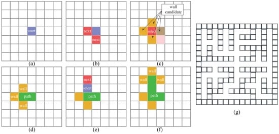Process of maze generation based on Prim’s algorithm: (a) selection of starting cell; (b) determination of the next path from the starting cell; (c) creation of walls around the paths; (d) separation of paths and walls; (e) generation of a new path through selection of one cell with walls; (f) expansion of paths and walls; and (g) generation of maze patterns.