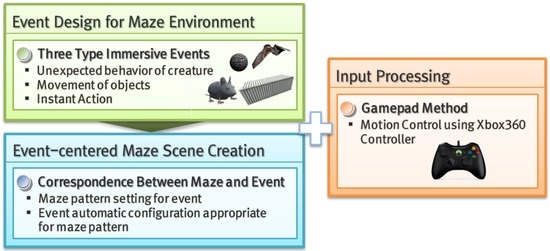 - It designs events that are appropriate for maze environments in virtual reality and provides a novel environment where users can focus on the maze centered at the events.