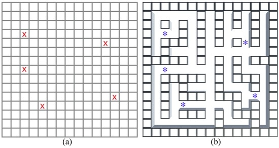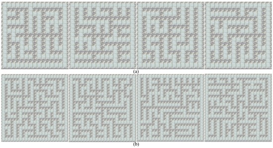 Results of generating various maze patterns according to the maze size: (a) 15 × 15 maze; and (b) 23 × 23 maze.