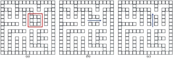 Path generation scheme for solving the problems of the event-centered maze pattern: (a) problem of maze patterns; (b) generation of left-and-right direction paths; and (c) generation of up-and-down direction paths.