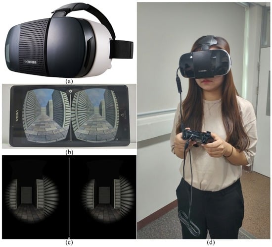 Experience environment of the contents using the proposed maze space: (a) mobile HMD (Head Mounted Display) used in the experiment; (b) operation outcome of the mobile virtual reality contents; (c) actual maze scene used in the experiment; and (d) users’ experience.