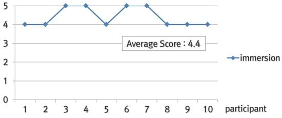 Participants in the experiment responded to the survey in the following two question domains: the appropriateness of the maze environment for the immersive virtual reality content and the impact of the proposed event factors on immersion. Users responded to all questions with a score between 1 and 5. Figure 12 shows the experiment results of the appropriateness of the proposed maze-type virtual reality scene as immersive virtual reality content. All the participants replied positively, where the satisfaction score regarding immersion was as high as 4.4 on average. Hence, we could confirm that virtual reality content that uses mazes can provide new directions for enhancing immersion.