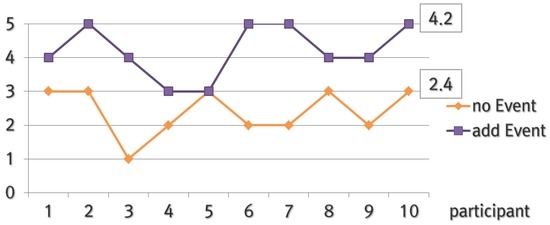 The final one is a comparison experiment of immersion of the events proposed in this study. As this study creates mazes centered at events rather than using simple maze patterns, the existence of events is a critical factor. Figure 13 presents the results of the comparison experiment. Comparing the immersion with or without events, the immersion score was 2.4 without events and 4.2 with event application. This implies that applying events is very helpful in increasing immersion. Here, the score is a relative value that compares the immersion according to the existence of events.