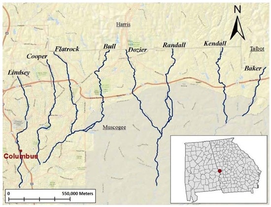Eight creeks (Lindsey, Cooper, Flatrock, Bull, Dozier, Randall, Kendall and Baker) within the Bull and Upatoi Creeks Watershed (within the Middle Chattahoochee basin, Muskogee County, Georgia) create a sampling design typical of urbanization studies located in western-central Georgia where the level of urbanization and land use change spatially along a gradient (e.g., [33,34,35]). Creeks are located north of Fort Benning and east of Columbus (Figure 1), flow southward and are considered Piedmont streams based upon stream characteristics and location [36].