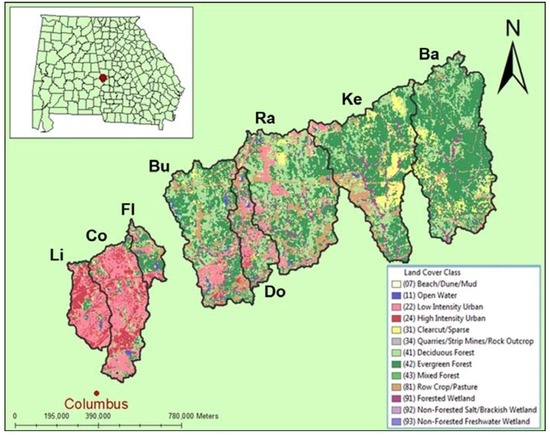 - Crim, J.F. Water Quality Changes Across an Urban-Rural Land Use Gradient in Streams of the West Georgia Piedmont. Master’s Thesis, Auburn University, Auburn, AL, USA, December 2007. [Google Scholar]
