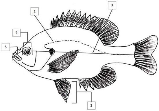 Meristic and metric dichotomous characters that are conserved between Lepomis species [27] were selected and quantified. Meristic characters: (1) pored lateral line scales; and (2) pelvic fin rays were not used in analyses. Metric characters included: (3) distance from the back edge of the eye to the caudal peduncle; (4) eye diameter; and (5) the front edge of the eye to the tip of the snout and were used in analyses as these continuous (not discrete) data offered bilateral variation.