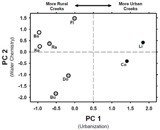 Principal components analysis (PCA) showing the relative similarities among creeks within multivariate space. PC1 (principal component) explains 51% (eigenvalue 4.605) of the variation among creeks with respect to urbanization where impervious surface, land use, and population density loaded heaviest. PC2 explains 18% (eigenvalue 1.615) of the variation among creeks with total suspended solids (TSS), orthophosphate (negatively correlated), and sulfate (positively correlated) loading heaviest for water chemistry. Black, gray, and white points represent most urban, intermediate and most rural creeks, respectively.