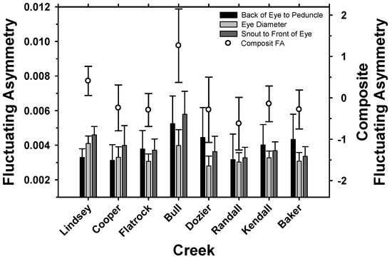 Because metric characters and FA values may be positively influenced by body size [52], we analyzed the relationship between each metric character and body size. We found eye-peduncle distance (F1,426 = 24.3, r2 = 0.05, P < 0.001), eye diameter (F1,426 = 59.7, r2 = 0.12, P < 0.001), and eye-snout distance (F1,426 = 70.73, r2 = 0.14, P < 0.001) to be positively influenced by standard length. Prior to additional analyses of FA (and the calculation of composite scores), we corrected all FA values for the effects of scaling using the correction outlined in [52]. We found significant differences in FA of fishes among creeks (Table 5). All three FA measures were generally highest in Bull and Lindsey Creeks (Figure 6). Raw FA values by creek (mean difference between repeated L and R measures, standardized by body length) ranged from 0.0012 (Dozier) to 0.0018 (Lindsey) in eye diameter; 0.0025 (Cooper) to 0.0042 (Bull) in distance from front of eye to snout; and 0.0025 (Cooper) to 0.0042 (Bull) in distance from back of the eye to the caudal peduncle.