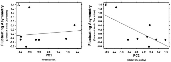 The relationship between the composite fluctuating asymmetry scores and the: (A) urbanization; and (B) water chemistry PCA scores. See Table 6 for summary statistics.