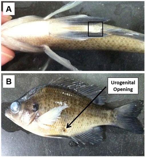 Fish (L. auritus) specimen collected (6 October 2012) from Cooper Creek showing major deviation in symmetry for the location of the urogenital opening. The urogenital opening is not present along the sagittal plane (A) but rather located on the left lateral side of the body; (B) Such a specimen is referred to as a major phenodeviant. This specimen is archived in the ichthyology range of the Sam Houston State Vertebrate Museum (SHSVM #1375).