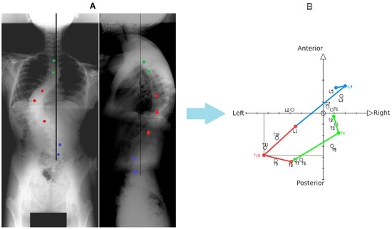 The human spinal column is composed of 34 vertebrae which are set up in a specific alignment in the sagittal plane: lordosis in the cervical and lumbar parts and kyphosis in the thoracic and sacral parts. In a healthy individual in standing position one does not observe any lateral deviation of vertebrae from the midsagittal plane nor rotation of vertebrae in the axial plane. Idiopathic scoliosis is a condition where the thoracic or lumbar vertebrae are displaced in all aforementioned planes [1,2]. Treatment of spinal deformities imposes a precise description of the spatial location of each vertebra. In clinical practice, the analysis of morphology of scoliotic spine is based on two radiographic images: antero-posterior and lateral [3,4,5]. However, no direct visualization of the axial plane has been provided. The three-dimensional deformity of scoliosis can be observed using computer tomography (CT) or a biplane low-dose X-ray imaging system (EOS) [6,7,8]. In 1983, De Smet et al. proposed the “Top view” [9]. At the “top view” the spine is presented from the cephalad side as if the observers were above the patient looking down on him. The “3D Classification Committee” of the Scoliosis Research Society (SRS) introduced two graphical presentations of the axial plane spinal deformity, the so called top views: (1) “True da Vinci Projection” and (2) “da Vinci Representation” [10,11,12]. The “True da Vinci Projection” demonstrates the position of the end-apical-end planes (EAE-planes) of the spine segments. EAE-plane is a plane determined by the apical vertebra and two end vertebrae [11]. The “Da Vinci Representation” demonstrates the orientation of the plane of maximum curvature in the axial view. The spinal curves are represented by the arrows. The length of the arrows is proportional to the curve severity. The angular position of the arrows with respect to the sagittal plane informs us about the position of the plane. The position and the length of the arrows demonstrate the relative importance of the coronal deformity with respect to the sagittal curvature [11]. Both presentations provide additional information to the standard coronal and sagittal radiographic projections and were used during development of the EOS system.