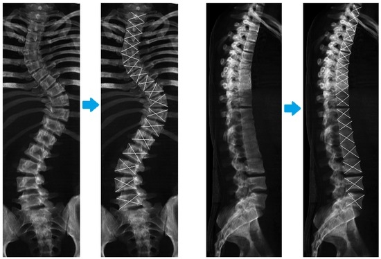 - Kim, H.; Kim, H.S.; Moon, E.S.; Yoon, C.S.; Chung, T.S.; Song, H.T.; Suh, J.S.; Lee, Y.H.; Kim, S. Scoliosis imaging: What radiologists should know. Radiographics 2010, 30, 1823–1842. [Google Scholar] [CrossRef] [PubMed]