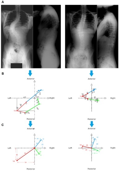 - Hattori, T.; Sakaura, H.; Iwasaki, M.; Nagamoto, Y.; Yoshikawa, H.; Sugamoto, K. In vivo three-dimensional segmental analysis of adolescent idiopathic scoliosis. Eur. Spine J. 2011, 20, 1745–1750. [Google Scholar] [CrossRef] [PubMed]