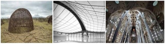 The use of symmetrical curves dates back to the dawn of building shelter and vernacular architecture, which relies, given the nature of the materials and construction techniques used, almost entirely on symmetry (Figure 1, left). In the Middle Ages, descriptive geometry was used for the planning and execution of building projects for which symmetric curves were the reference model, as in the design of arched hallways and corridors (Figure 1, middle). In the last century, the Spanish designer and architect Antoni Gaudi used the same kind of geometry for the design of the Sagrada Familia in Barcelona (Figure 1, right) and many of his other fabulous structures, which can be appreciated by taking a walk through the Park Guëll, or by visiting the Guëll museum in Barcelona. In Antoni Gaudi’s three-dimensional design of arches, for churches or natural environments, there is a clear distinction between physical (objective) and subjective (perceived) symmetry. Physical symmetry takes into account the principles of gravity. As a consequence, a resulting real-world structure may not necessarily be perceived as perfectly symmetrical (cf. Figure 1, image on right).