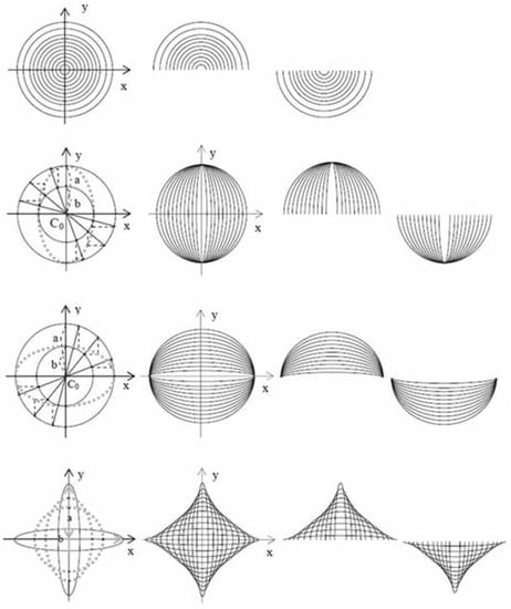In affine geometry, curves derived from circles and ellipses share certain properties, the circle being a particular case of the ellipse. Projective geometry permits generating symmetric curves from ellipses by affinity with concentric circles (Figure 2). Their perception is grounded in biology in the sense that most natural objects can be represented in 2D as symmetrically curved shapes with Euclidean properties of ellipses. Studies comparing between visually perceived curvature by experts in geometry (architects and design engineers) and non-experts [] by using symmetric curves derived from concentric circles by affine projection have shown that their perceived magnitude is determined by a single geometric parameter, the curves’ aspect ratio. The perceptual responses to such curves are independent of both expertise and sensory modality, given that tactile sensing by sighted blindfolded and congenitally blind observers produces the same results []. The symmetry of the curves, however, is a critical factor to these geometry-based perceptual responses []. The aspect ratio relates the height (sagitta) to the width of a curve, and in symmetric curves of variable size but constant aspect ratio directly taken from concentric circles (no projection by affinity), perceived curvature is also constant, in both vision and touch. This observation is directly linked to the phenomenon of scale-invariance in visual curvature discrimination [] and the detection and recognition of shapes in general.