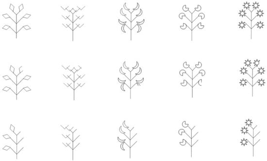 Fifteen images of fractal mirror trees were designed using some of the principles of transformation shown in Figure 2 and Figure 3. The first five trees (top) possess perfect “symmetry of things in a thing” across the vertical axis. In the next set of five (middle), the smallest of fractal details is missing on the right. The remaining five trees (bottom) are asymmetrical. It is noted that in these tree structures here, only the symmetrical ones (top) appear perceptually complete.