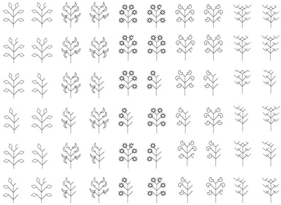 Nature-inspired design occupies an important place in contemporary graphic art, and symmetry has been identified as a major defining feature of visual beauty, compositional order, and harmony. Symmetry directly determines aesthetic preferences and the subjectively perceived beauty of two-dimensional visual images and patterns [,,,,,], and symmetrical visual patterns are also more easily remembered and recognized [,,] compared with asymmetrical ones. Sabatelli et al. [] suggested that natural and artistic creative processes rely on common, possibly fractal transformations. Fractal transformations may describe iterative transitions from simplicity and order (symmetry) to complexity and chaos (asymmetry). Again, fractal trees seem to be a pertinent example here, where simple 2D mirror trees (Figure 3) with reflection and/or radial symmetry open an almost infinite number of possibilities for adding complexity through further transformations leading to complex projections of 3D structures with multiple rotational symmetries (not shown here).