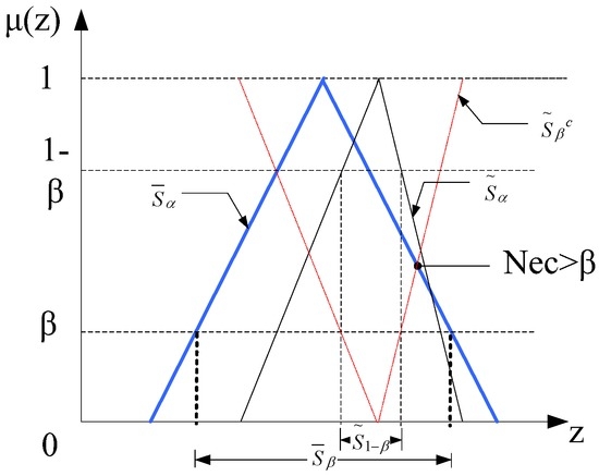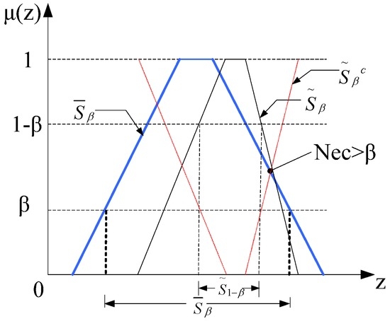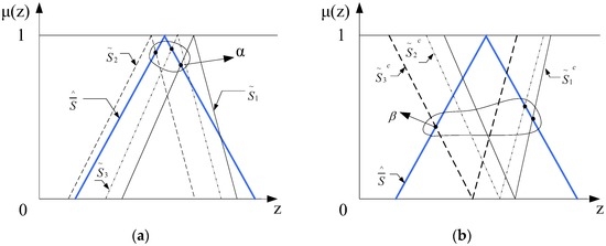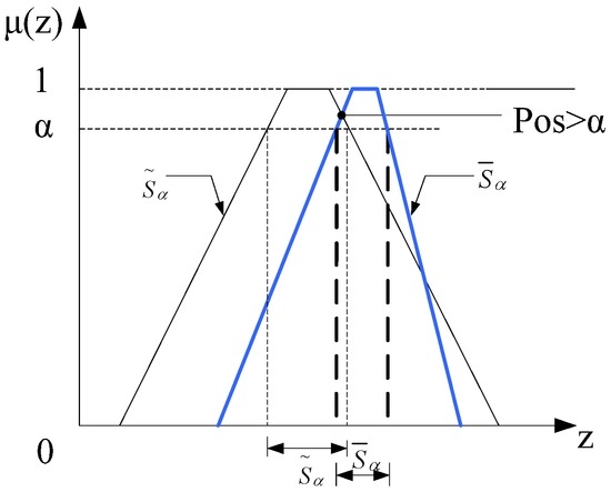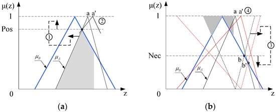The necessity measure is shown in Figure 1b, whose value is the lowest point of the shadowed area, and denotes the matching degree of necessity between fuzzy numbers A and B. The given Nec can limit the value range of elements in B for known A. As shown by the symbol ④ in Figure 1b, when the vertex of B moves from to , the value of Nec decease from to , although the value of Pos remains the same, shown by the symbol ② in Figure 1a. So, the matching degree between fuzzy numbers A and B can be judged synthetically by selecting the appropriate combination of Pos values and Nec values.