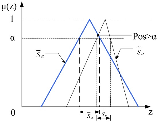 Taking triangular fuzzy number as an example, the possibility measure is shown in Figure 1a; its value is the highest point of the shadowed area and denotes the matching degree of possibility between fuzzy numbers A and B. However, for a given Pos, there are no constraints on the vertex of B, and in Figure 1a, a and a′ all satisfy the given Pos.