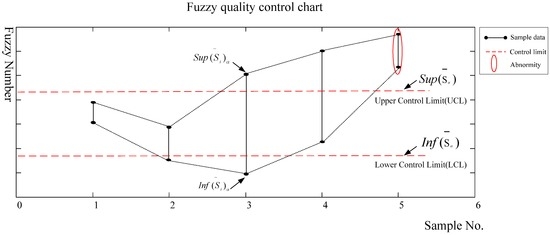 The plotted data of fuzzy control chart is the supremum and infimum of of quality characteristic-scoring sample fuzzy number, which is denoted as a line segment connecting and . The upper and lower control limits are supremum and infimum of mean scoring fuzzy number, respectively. The fuzzy control chart is judged abnormal when the set of sample fuzzy number and process mean fuzzy number do not meet the two criteria.