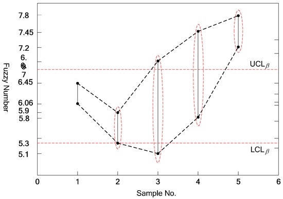 Step 2: Determine the parameters of nonconformity judgment. In this case study, the parameters were set as and in terms of Formulas (10) and (11). The upper and lower control limits, 6.2, 5.8 and 6.7, 5.3, were the right and left endpoints of and of process mean fuzzy number , respectively, according to Formulas (12) and (13).