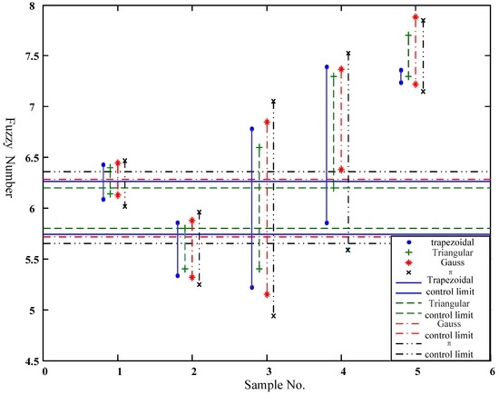Some indirect approaches were also proposed to build different types of control charts, for example, Shu et al. [10] constructed fuzzy and R control charts based on the fuzzy dominance between the fuzzy averages and variances, and Gildeh et al. [11] used Dp,q-distance between fuzzy numbers to calculate their variance, covariance, and autocorrelation coefficient, and then used the autocorrelation coefficient to modify the limits of the control chart. Zarandi et al. [12] constructed a fuzzy control chart for different process shifts by adjusting the membership function parameters. In order to detect small shifts represented by fuzzy numbers, fuzzy exponentially weighted moving average (EWMA) control charts for univariate variable was developed by Sentürk et al. in [13]. Faraz et al. [14] constructed a fuzzy control chart to treat two uncertainties of fuzziness and randomness in data.