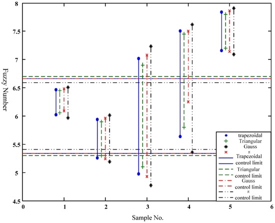 Taking the triangular fuzzy number data set shown in Table 1 as an example, the respective parameters of a fuzzy control chart for trapezoidal-type, Gauss-type, and π-type functions are shown in Table 2.