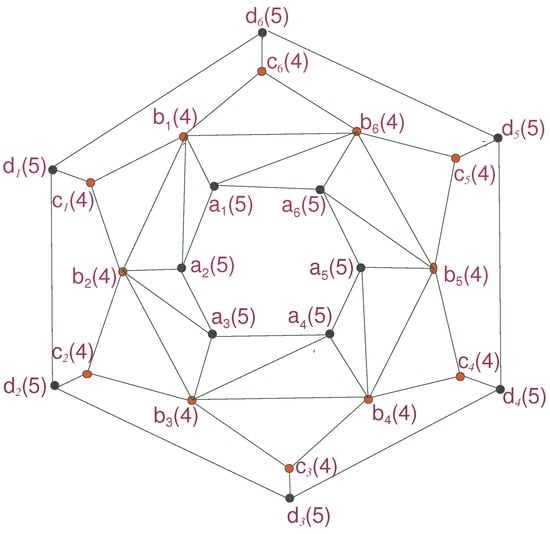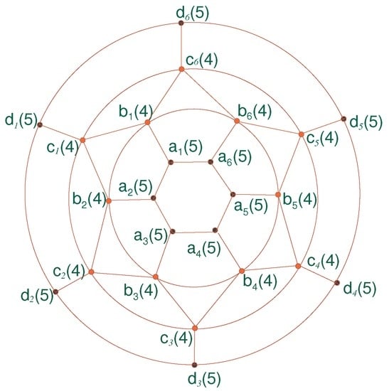 Further, to find out the eccentricity of the vertices on the outer cycle , choose a vertex on this cycle. The distance between and is .