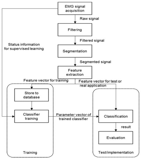 The pattern recognition algorithm categorizes numerous input patterns to specified outputs. Generally, pattern recognition is dealt as a subtask of the machine learning algorithm. Figure 1 depicts a flow diagram of the entire EMG pattern recognition process.