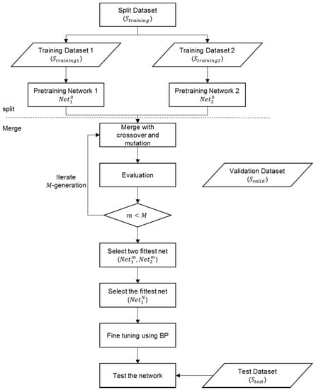 Figure 3 shows the flow diagram of the SM-DBN. At the start of the process, data set is divided into two subsets and . At this point, these should have an intersection set. Each subset is trained by its corresponding DBN. Each DBN has the same bias vectors. This network information is treated as chromosomes in the merge phase of GA. Moreover, the crossover and mutation occur in this phase. In this paper, the uniform crossover method is used. The performance of each offspring created after the merge phase is evaluated by counting the number of errors (zero-one loss) using a validation set, . If is the prediction function, then this loss can be expressed as: