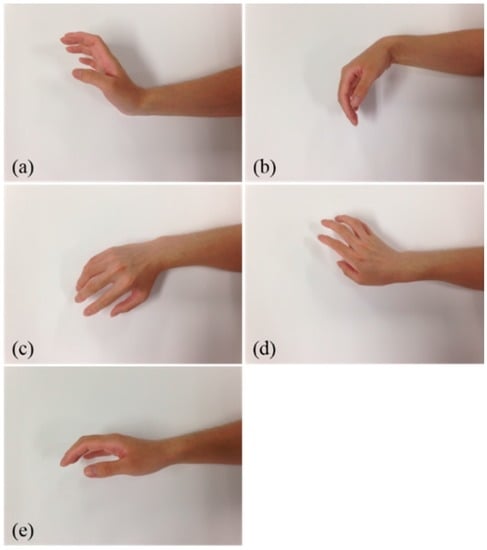 Five types of wrist motions. (a) Up; (b) Down; (c) Left; (d) Right; (e) Rest.