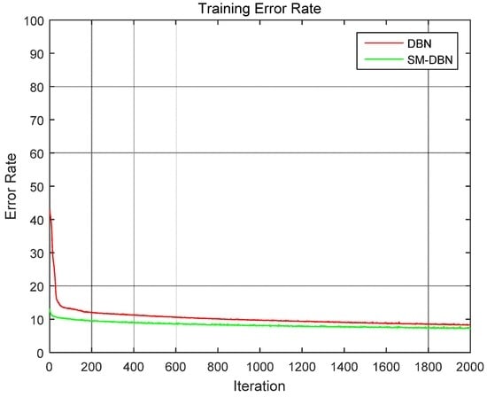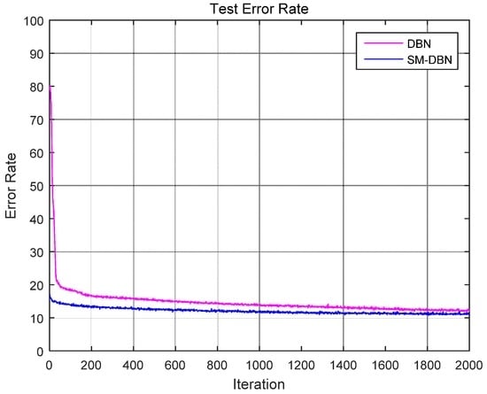 A ten-fold cross-validation was used for statistical evaluation. In the cross-validation method, the entire dataset was divided into k sub-datasets. The classifier was trained with a training dataset, and it was then validated with a test dataset. Every dataset must be used for the test set more than once. In our work, the dataset was divided by 10 randomly. Eight subsets were then used for training, another subset was used for validation, and the rest were used for the test set. There were ten possible cases. Table 2 shows the validation test results. After 2000 iterations, the average error rate of the DBN was 12.00%. On the other hand, the error rate of the SM-DBN was 10.079. Moreover, the standard deviations of the DBN and SM-DBN were 1.086 and 1.050, respectively. Once the average result of 10 trials was compared with the DBN, the error rate of the SM-DBN was found to be 12.06% higher.