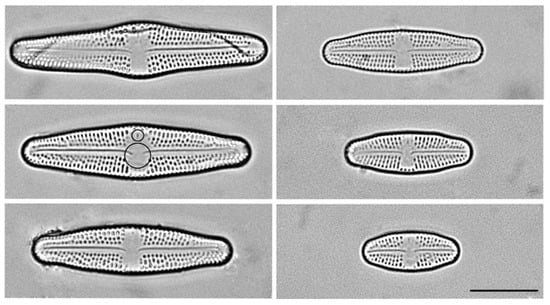 The diatoms (Bacillariophyceae) are a group of peculiar, mostly unicellular organisms with unusually complex patterns of morphological symmetry of their surface structures. A shell called the frustule, which is composed primarily of SiO2 and consists of two halves (the epitheca and the hypotheca), surrounds the cell. The slightly smaller and younger half is formed following the vegetative binary division of a cell; during the formation of the younger half, the remaining epitheca serves as a mold for the synthesis of the new half []. In a series of successive vegetative divisions, this leads to a cell size reduction in a population. During this cell size diminution, the nucelar/cytoplasmic ratio changes, as well as the surface/volume ratio. This might influence the “cellular activity and developmental potential” [,] resulting in different cell division rates in different size classes and therefore nonlinear distribution of cell sizes in a population [,]. This cytological heterogeneity might also lead to subsequent morphological heterogeneity in a population []. Cells that attain a species-specific critical size as a result of numerous vegetative divisions typically transform into gametes and reproduce sexually. Vegetative cells that then begin a new cycle again are in the upper size range of the species-specific interval []. Size reduction is typically accompanied by a change in the shape of the frustules [,,,], which leads to pronounced morphological allometry, a process typical of nearly every diatom population in natural habitats or cultured strains. Pappas et al. [] recently reported that variation in the empirical morphospace of most pennate diatom species relates to allometry as a result of the size reduction that occurs over successive vegetative cell divisions. Interestingly, these authors also suggested that the second most important variation pattern usually involves the asymmetry of valve outlines.